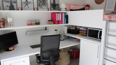 Volledig en modern ingericht : 5e verdiep, rustig op einde van de gang Hoogslaper, lattenbodem (zonder matras), boekenrek, kleerkast, ...