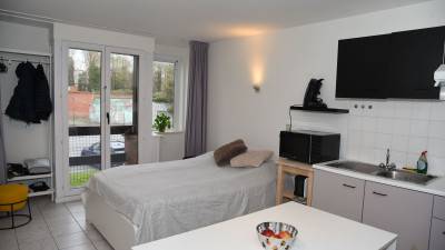 Gemeubelde studio met badkamer, lavabo, douche en WC, kookhoek met elektrische kookplaten, koelkast met diepvriesvak, internet, kabel-TV, du...