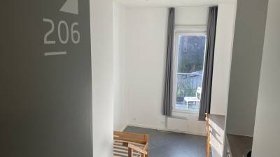 Deze studentenkamer heeft een wastafel, kleerkast, bureau en bed. De kamer heeft rechtstreeks toegang tot het gedeelde zonnig terras. In het gebouw (30 kamers) zijn er 3 gemeenschappelijke keukens. Douche en toilet worden gedeeld met 4 andere kamers. De huurprijs bedraagt 500 euro. Het kostenforfait van 90 euro per maand omvat alle verbruik, het internet en de poets van de gemeenschappelijke delen. Er volgt geen afrekening op het einde van het jaar. All-in prijs is dus 590 euro per maand. Contract van 16/12/2025 tot 15/09/2026.