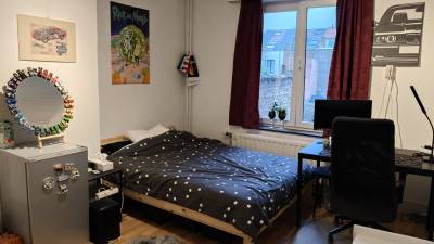 Mooie ruime studentenkamer van 16m2 , kotlabel, rustig gelegen, volledig bemeubeld (bed+matras, grote kledingkast, boekenkast, bureau), uits...