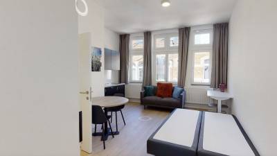 De studio bestaat uit een uitgeruste keuken met voldoende opslagruimte, een badkamer met douche, lavabo en toilet, alsook een slaap- en leef...